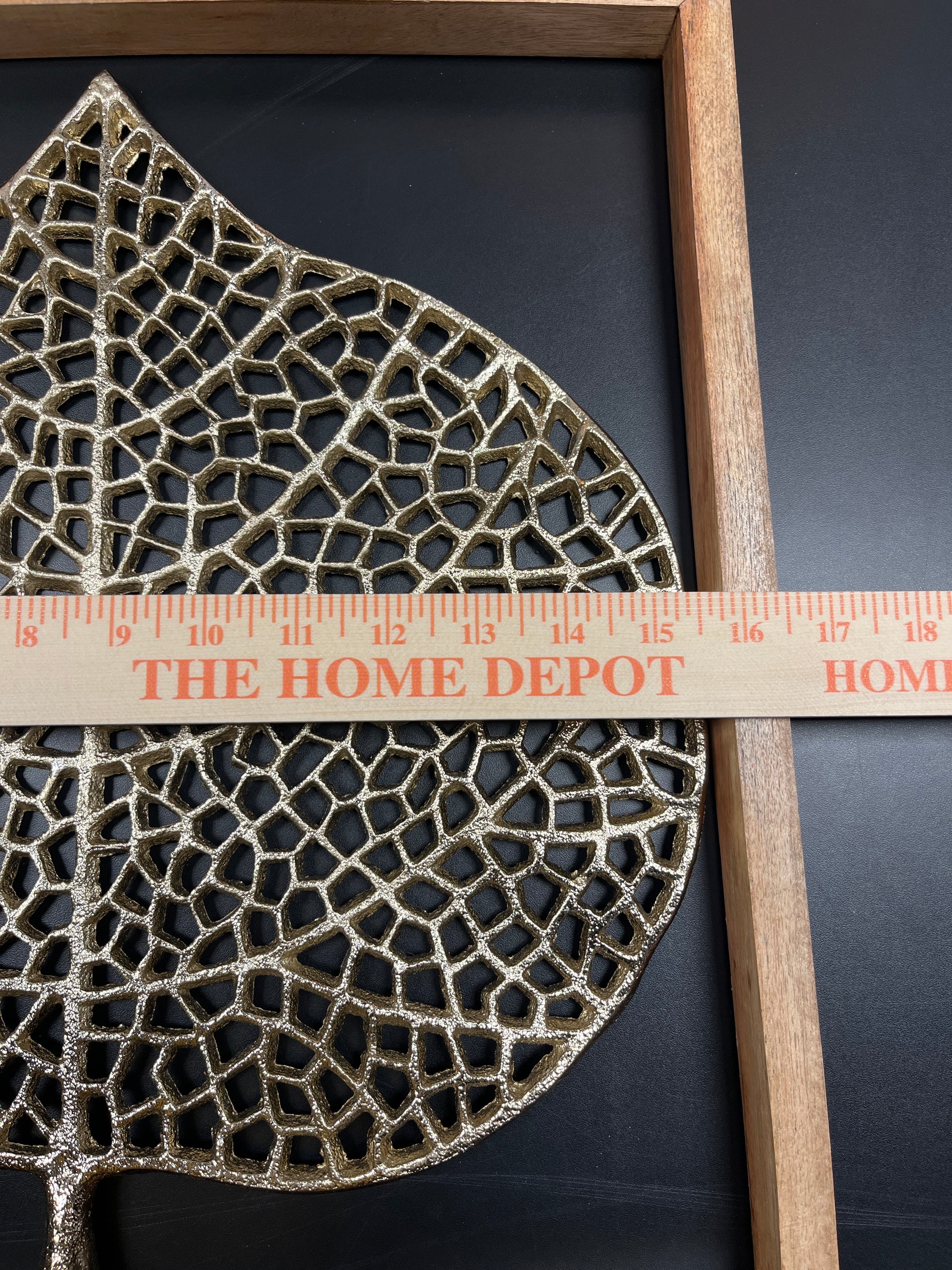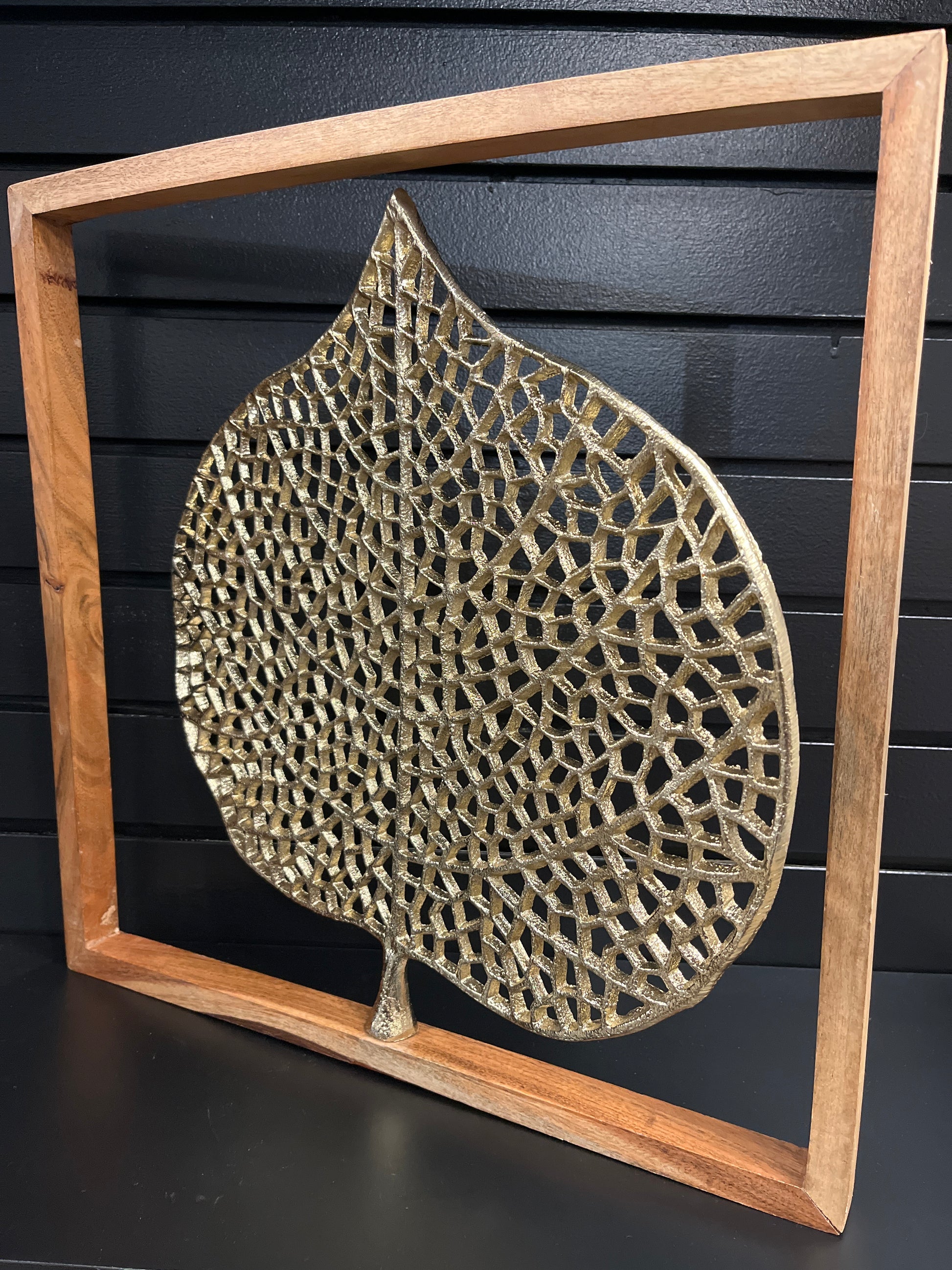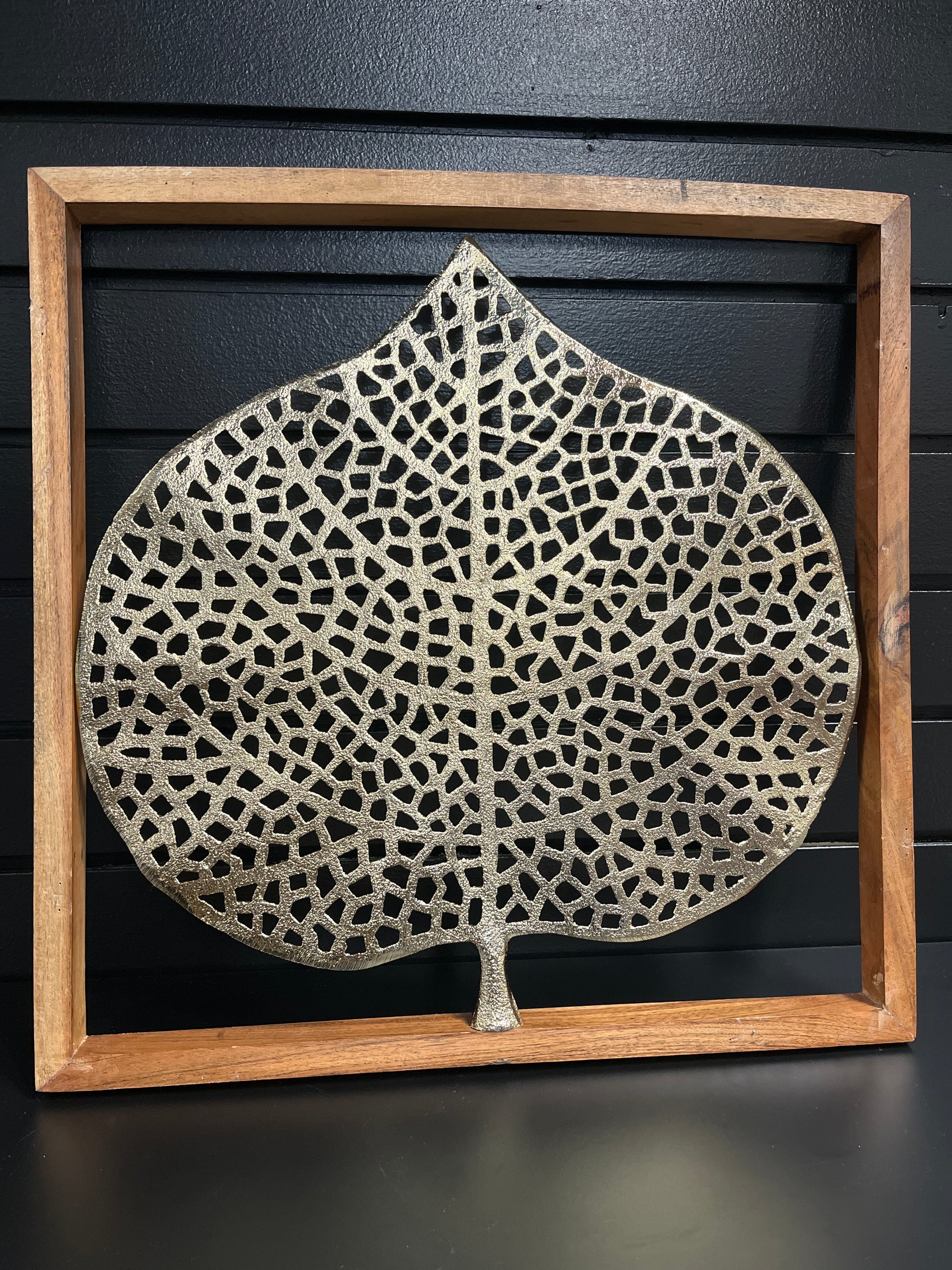 This striking peepal leaf sculpture captures nature's elegance in gleaming gold-toned metal, thoughtfully presented within a refined handcrafted recycled wooden frame. Measuring 14.5" x 15" for the leaf itself, the complete framed piece extends to 16.5" x 16.5", making it an impressive focal point for any room. Crafted from quality metal and manmade materials, this pre-owned treasure shows excellent condition, offering timeless botanical artistry with understated luxury. A sophisticated addition to contemporary or eclectic interiors.
