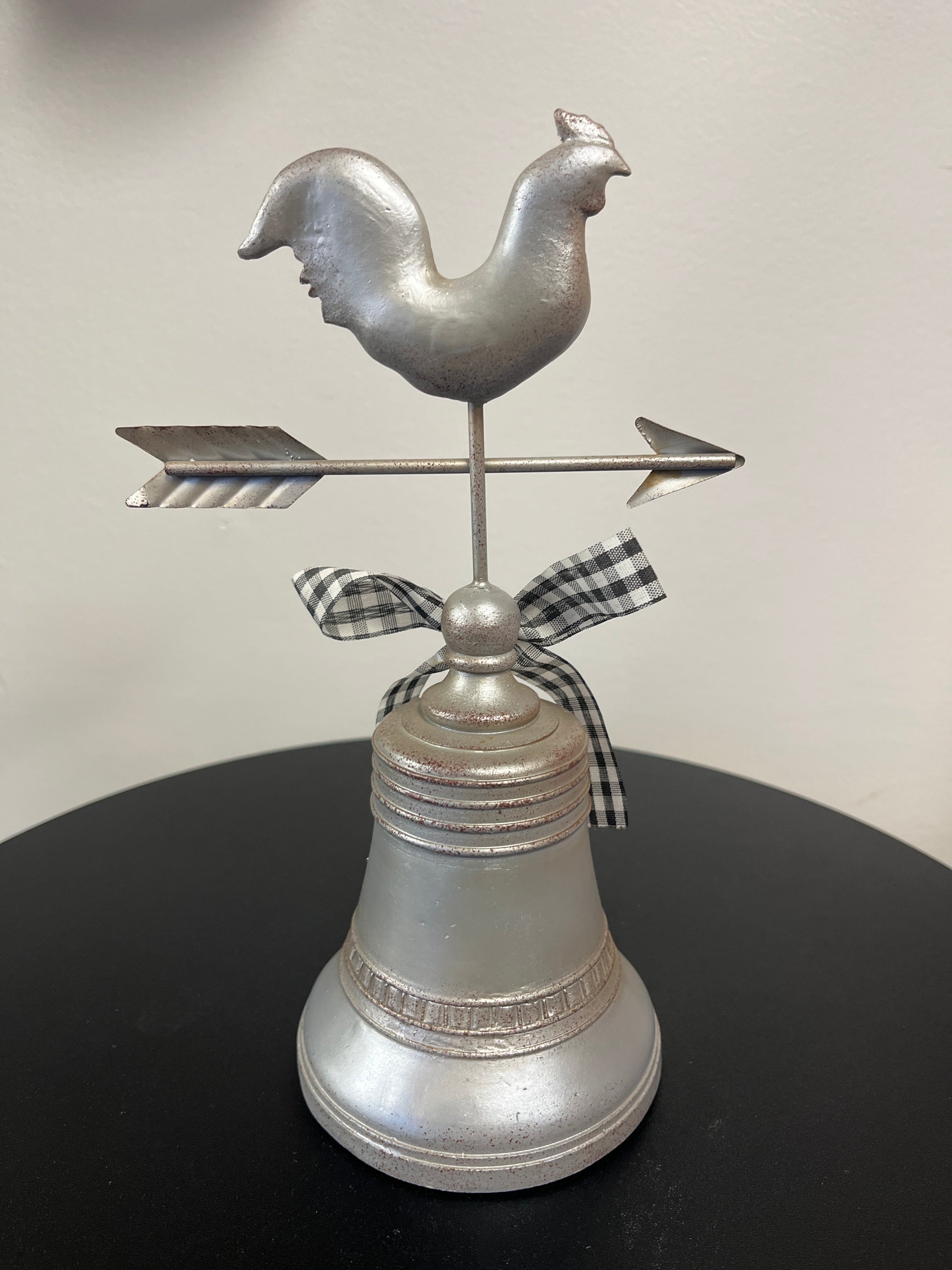 Bring timeless farmhouse charm to your holiday décor with this vintage tabletop rooster weathervane. Featuring a classic rooster and arrow design perched atop a bell, this pre-loved piece showcases an antique silver tone finish with authentic distressing that speaks to its storied past. A delicate black and white gingham ribbon adds a refined touch of country elegance. Crafted from metal with enduring character, this sophisticated accent piece transforms mantels, tables, and shelves into curated vignettes that celebrate rustic Americana and nostalgic style.