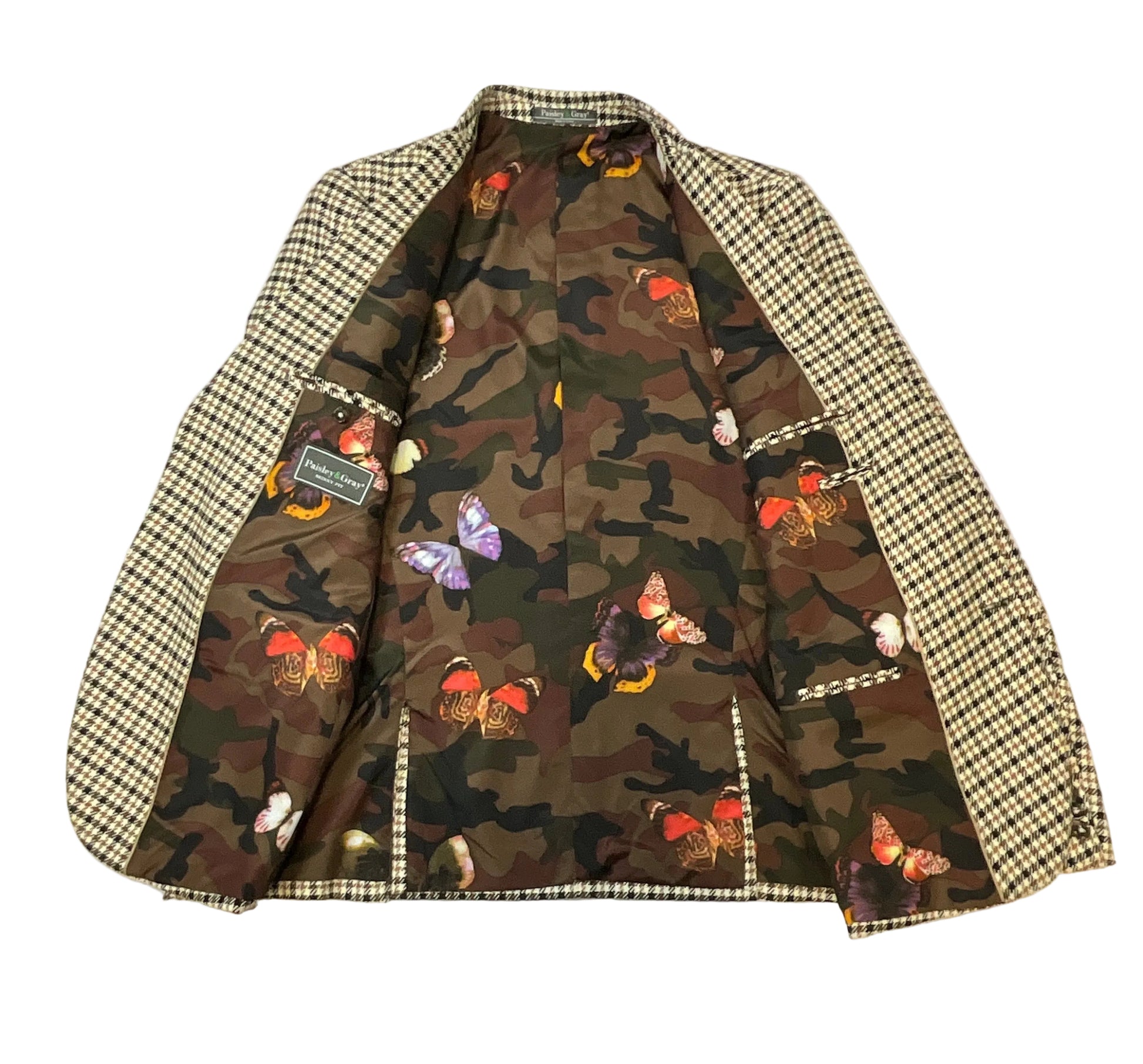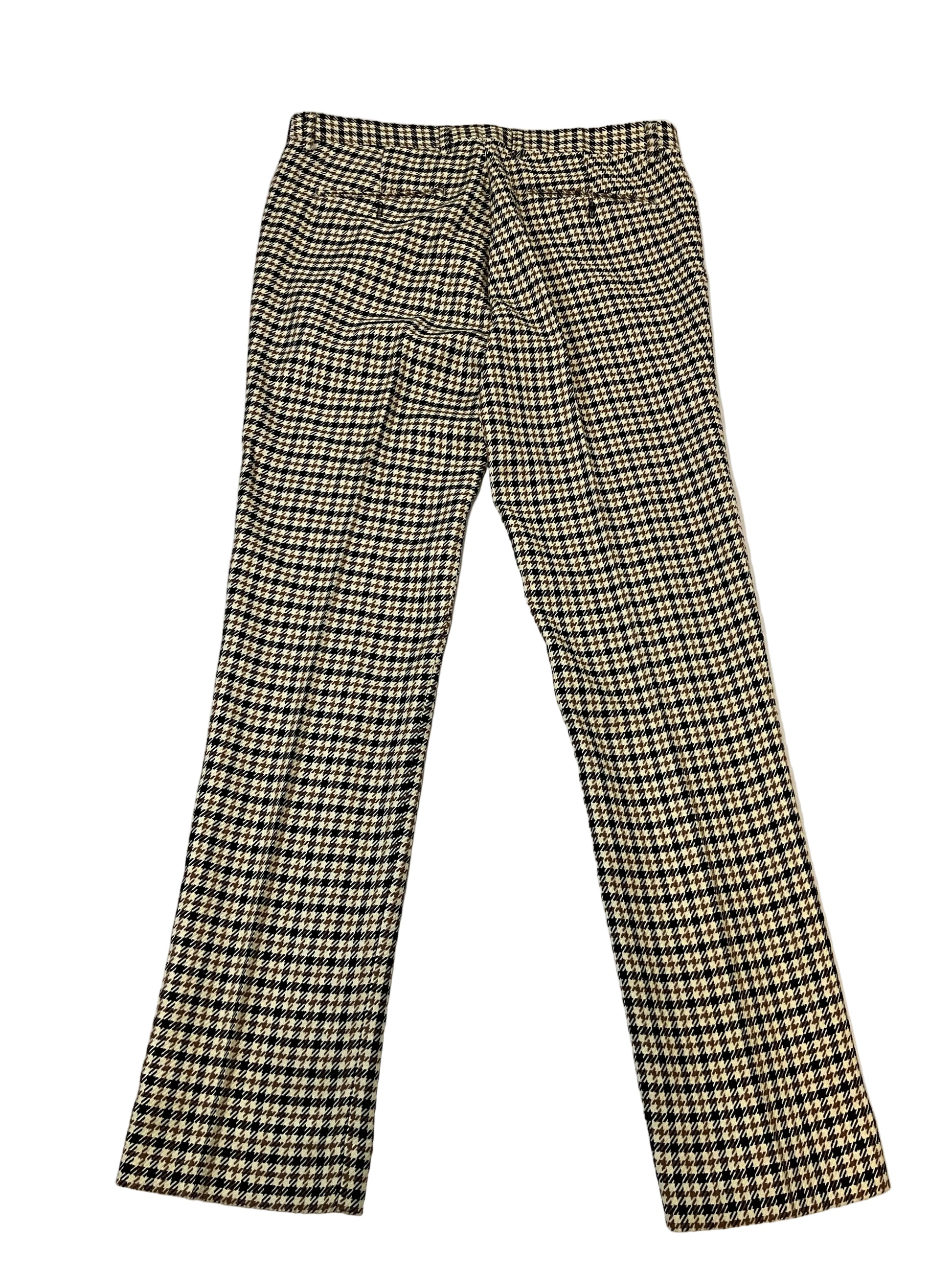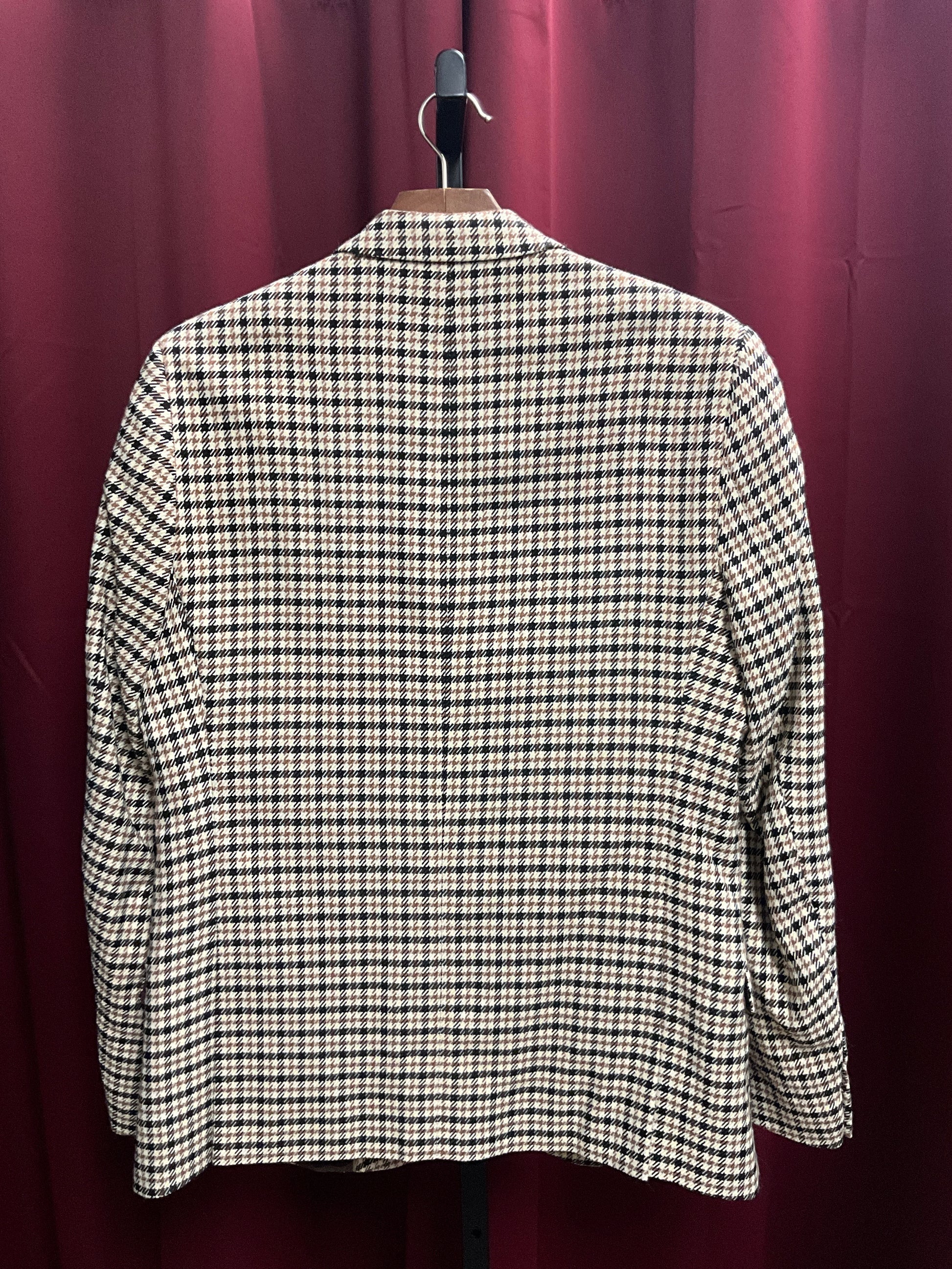 Make a polished statement with this distinguished Paisley & Gray three-piece suit, showcasing a refined houndstooth plaid pattern in warm beige hues. The contemporary skinny fit creates a sharp, tailored aesthetic ideal for upscale occasions. This gently worn ensemble comprises a 42R blazer, matching vest, and W32/32L pants constructed from a premium blend of polyester, rayon, and spandex that balances structure with flexibility. In good pre-owned condition, it represents exceptional value for those seeking quality menswear with timeless appeal.
