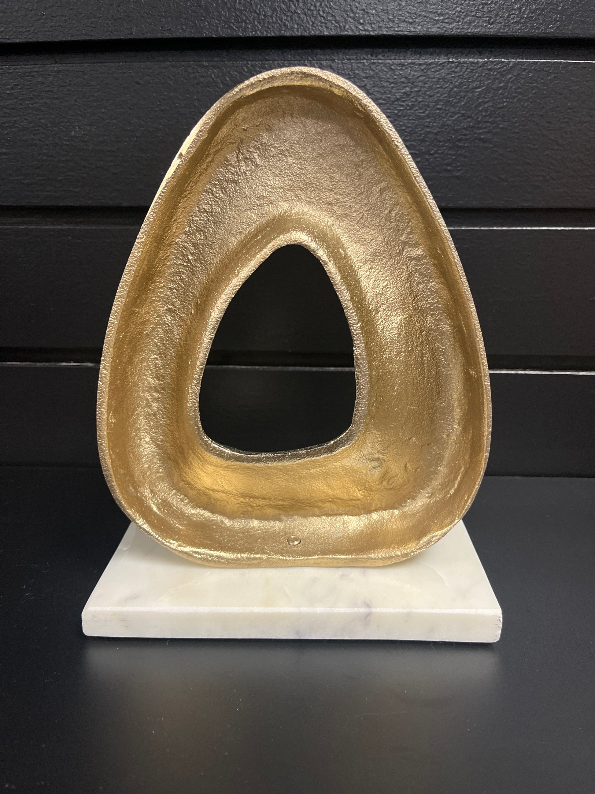 This refined abstract metal sculpture commands attention with its elegant gold-toned finish and sculptural presence. Mounted on a crisp white marble base, this beautiful piece showcases an organic flowing form with intricate texturing and a striking central void that creates visual depth. At approximate measurements of 6"L x 1.5"W x 7.5"H, it serves as an understated yet impactful accent for curated collections. A pre-owned treasure in excellent condition, this artistic statement piece brings contemporary sophistication to any interior setting.