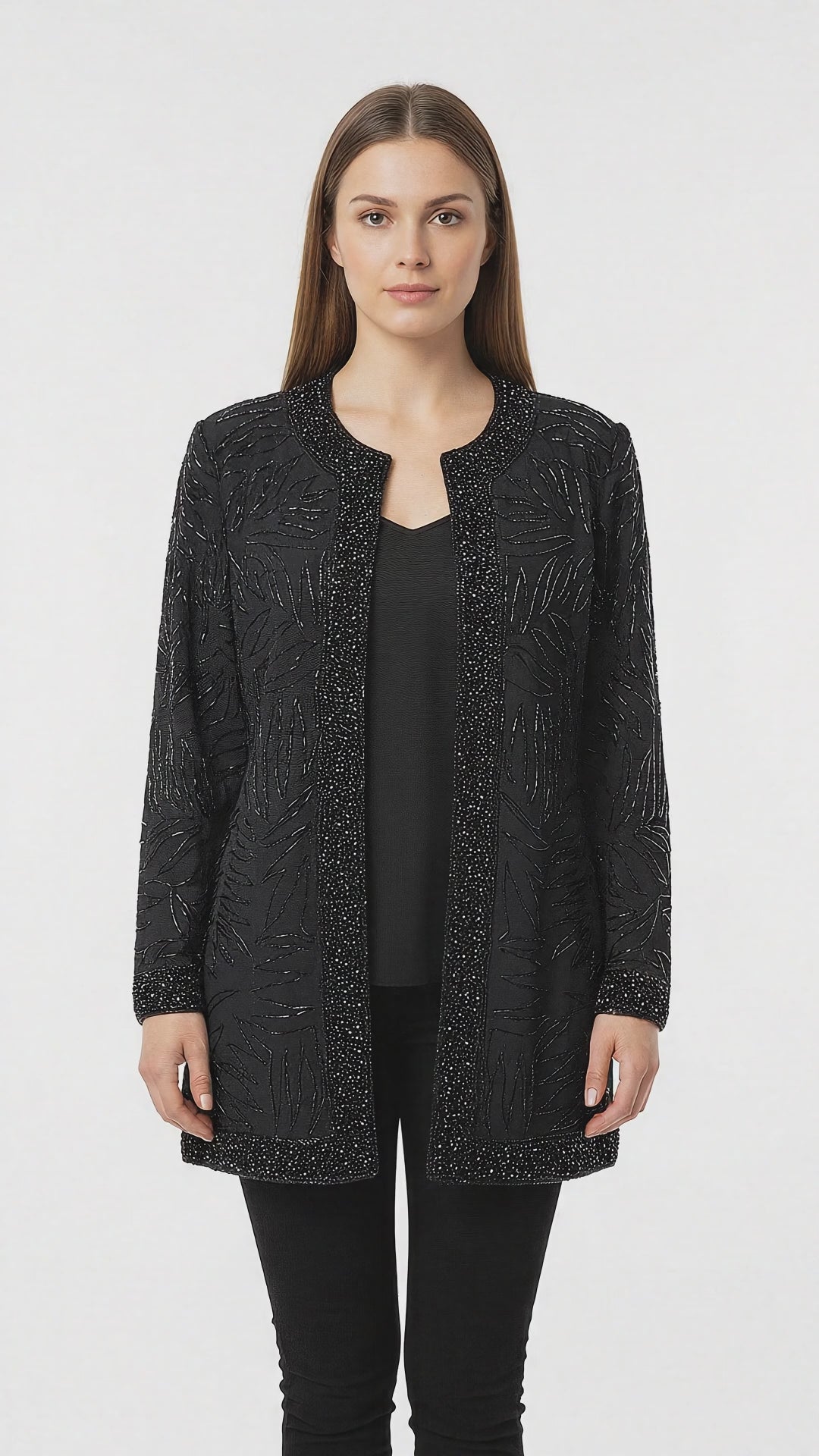 Brilliante by J.A. vintage beaded jacket in black—a timeless piece with understated glamour. This pre-owned medium features intricate beading throughout, perfect for elevating any outfit. Minor wear on the beading adds authentic vintage character. Polyester construction, 30" length. A sophisticated find for collectors of classic eveningwear.