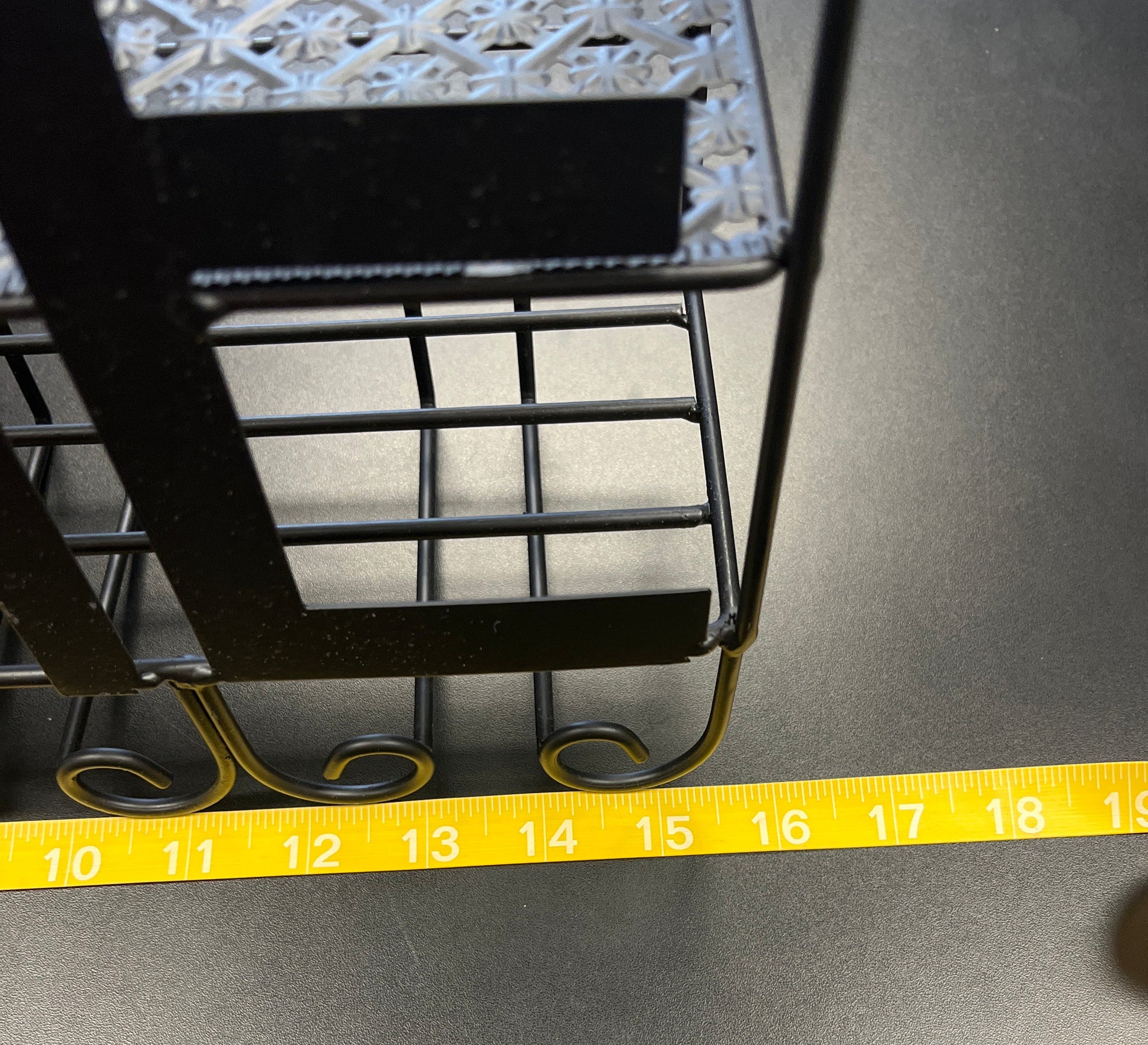 This elegant black wall-mounted wine rack combines functionality with understated style. Crafted from durable metal construction, it measures 16" L x 4.5" W x 9.5" H, making it ideal for displaying your collection while maximizing vertical space. The sleek black finish complements any décor aesthetic, from modern to traditional interiors. This wine rack also has a removable top tray to create additional space for more convenience. Perfect for wine enthusiasts seeking an organized, space-saving storage solution. This pre-owned piece is in good condition and ready to enhance your home.