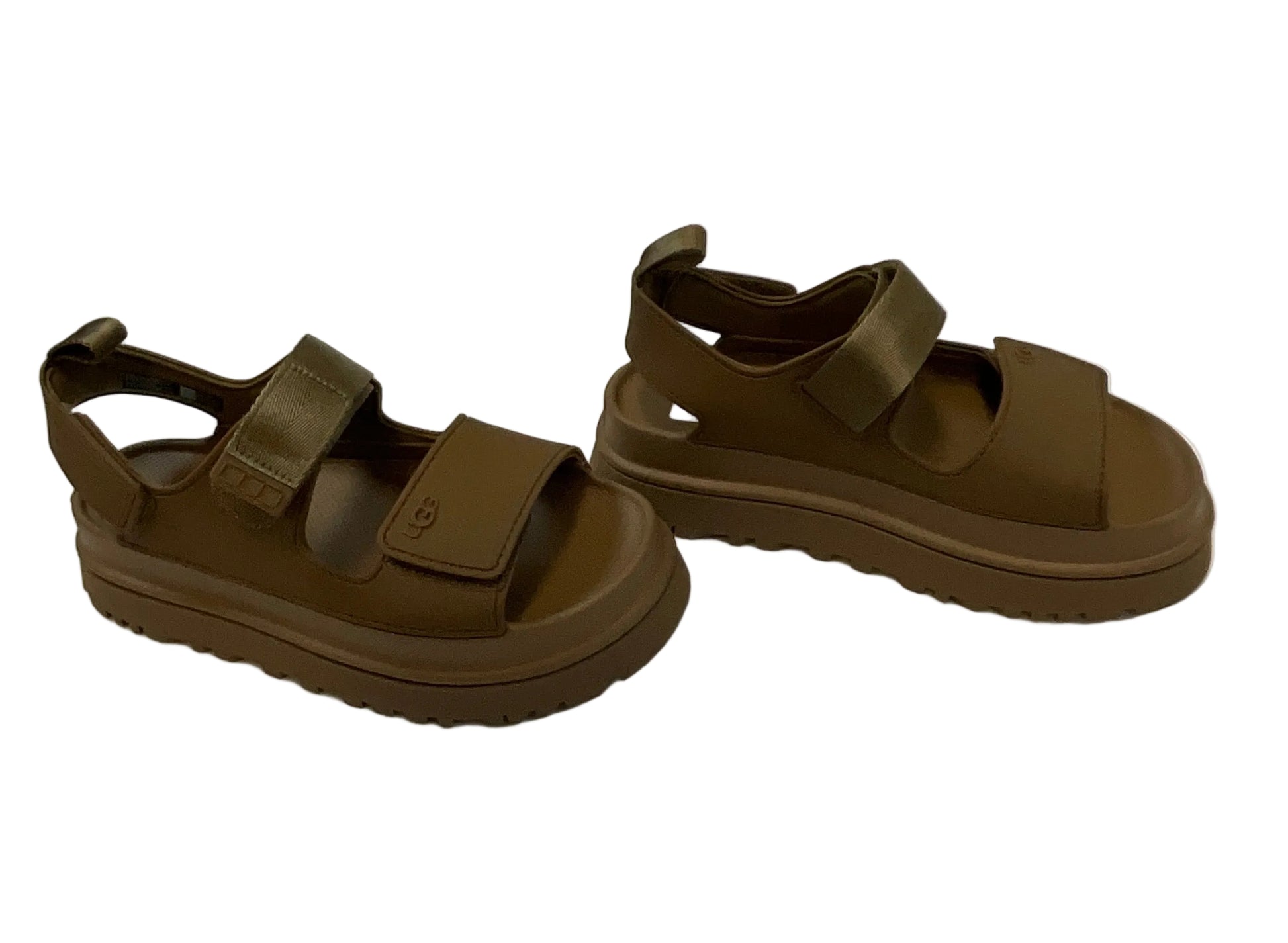 Experience all-day comfort with these UGG Women's Goldenglow Brown Sandals, size US 9. Built with sustainable materials—100% recycled polyester fibers and plant-based sugarcane EVA—these sandals support both your feet and the environment. The fully adjustable hook and loop closure adapts to your needs, while the grippy footbed and textured lug sole keep you steady on any terrain. Water-resistant design means you can wear them confidently through various conditions. The cushioned platform construction provides excellent arch support for extended wear. Arriving new with original packaging, these versatile bison brown sandals are a reliable choice for everyday adventures. New with Box.